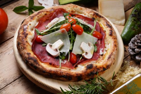 bainco sauce, baby Rocca, fresh muchroom, bresaola ,cherry tomato , walnuts, parmesan cheese,olive oil.