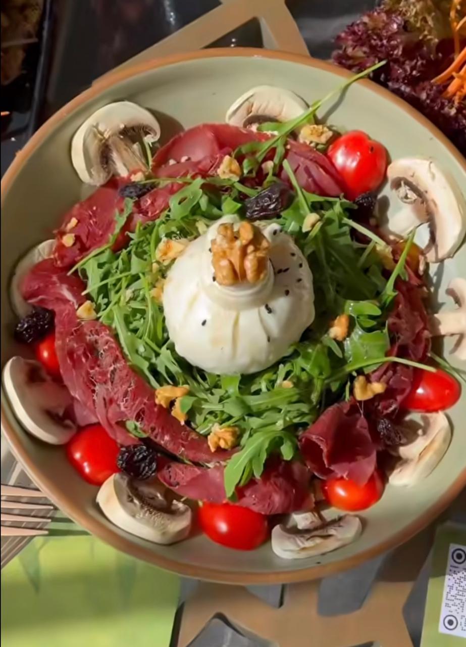 Baby rocca, bresaola,burrata,cherry tomato ,fresh mushrooms, walnuts,olive oil,served with balsamico sauce.