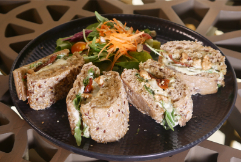 100G OF CRANBERRY GOAT CHEESE SERVED WITH BUGGETE,BABY ROCCA,CHERRY TOMATO