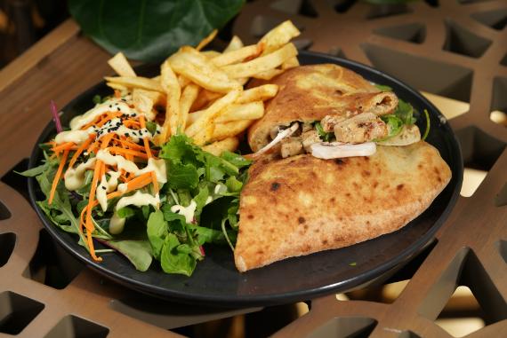 grilled chicken, ice berg, tomato, onion, pickles, mozzarella cheese, mayo sauce.