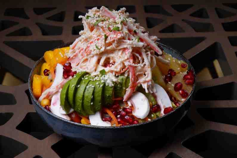 crab sticks,cherry tomato,avocado, pomegrenate , mango, pineapple, ice berg, corn, carrots ,Asian and lemon sauce