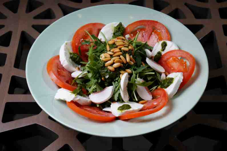 baby Rocca, fresh mozzarella,fresh mushroom, tomato slices ,pesto sauce, pine nuts