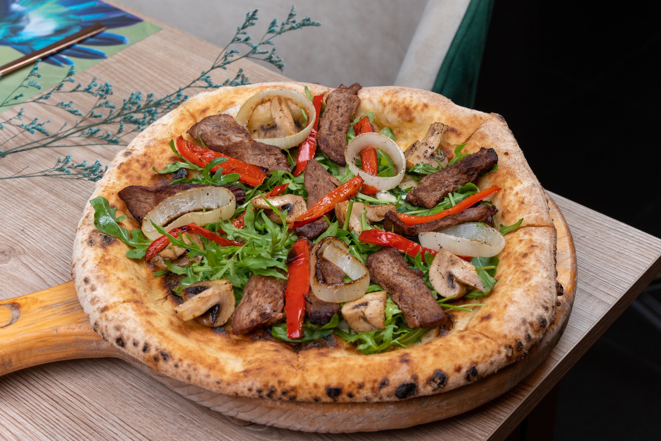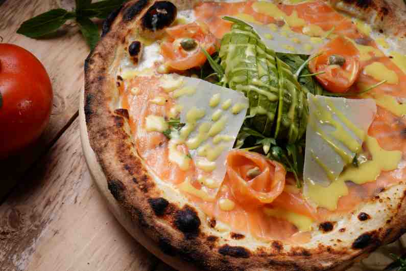 pistachio bianco sauce, mozzarella cheese, smoked salmon, baby Rocca, avocado, capre , cherry tomato, fresh muchroom, permesan cheese, lemon sauce