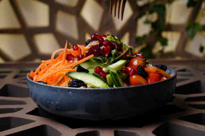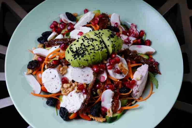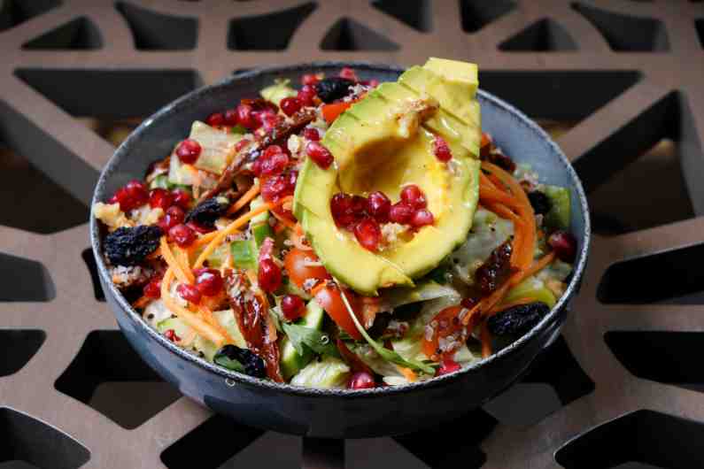 ice berg, Rocca,cucumber, mixed green ,mixed quinoa, carrots, cherry tomato,avocado,sundried tomato,walnuts , raisin ,lemon or balsamico sauce.