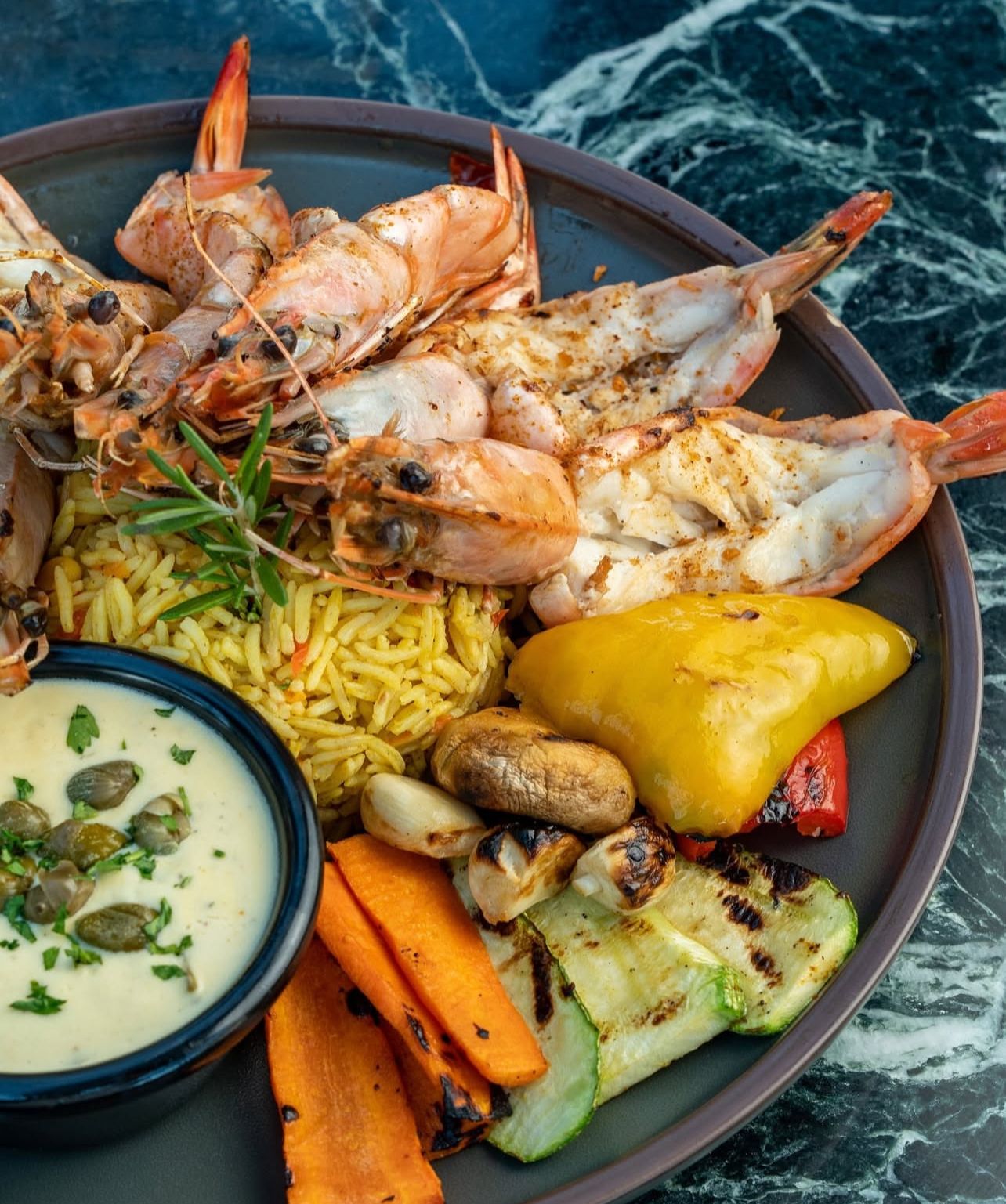 ricotta cheese, avocado,shrimps , capre, lemon sauce.
