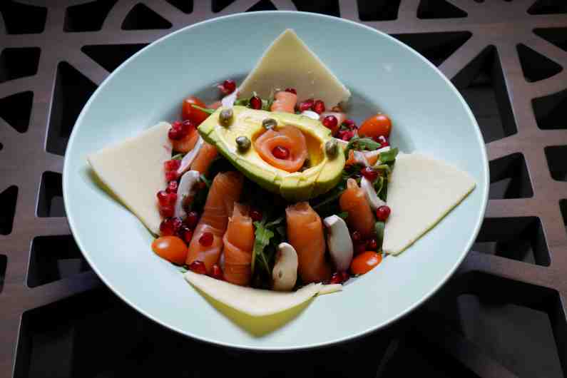 baby Rocca, cherry tomato ,mushroom ,parmesan cheese, smoked salmon ,avocado,lemon sauce