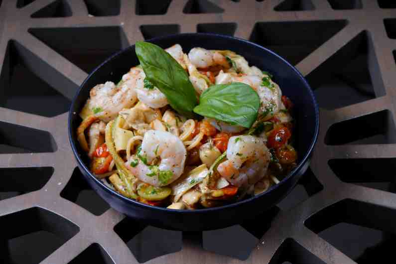 pomodoro basil sauce, shrimps, mozzarella cheese, permesan cheese.