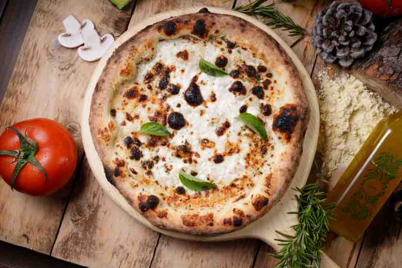 bianco sauce, mozzarella cheese, ricotta cheese, gorgonzola cheese, parmesan