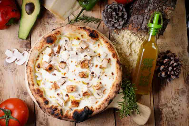 bianco sauce, mozzarella cheese, chicken , mushroom.